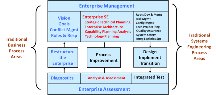 SE is viewed by many organizations and depicted in many process definitions as bounded by the beginning and end of a system development project. In DeRosa's paper this restricted definition was referred to as Traditional SE (TSE). However, he expands upon this to include additional processes that are essential to performing SE at the enterprise level. These ESE processes are shown in the context of the entire enterprise in the figure below. The ESE processes are shown in the middle with business processes on the left and TSE processes on the right.