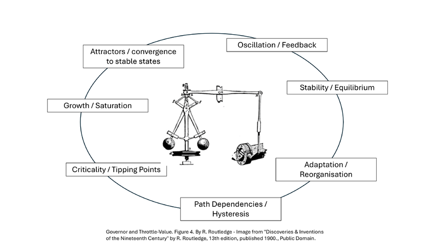 The governor demonstrates in mechanical form how centrifugal force, feedback, and thresholds can stabilize a system against perturbations, or, if mis-tuned, lead to oscillation and collapse. Similarly, across natural, social, and engineered systems, internal processes such as balancing and reinforcing feedback, attractors, and nonlinear thresholds drive recurrent dynamic modes.
