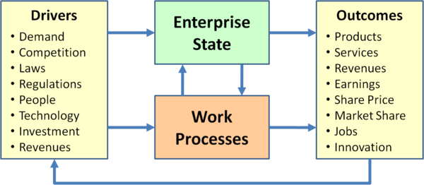 The purpose of the enterprise’s enabling assets is to effect state changes to relevant elements of the enterprise necessary to achieve targeted levels of performance. The enterprise “state” shown in the figure below is a complex web of past, current and future states (Rouse 2009). The enterprise work processes use these enabling assets to accomplish their work objectives in order to achieve the desired future states. Enterprise architecture (EA) can be used to model these states and the relative impact each enabling asset has on the desired state changes.