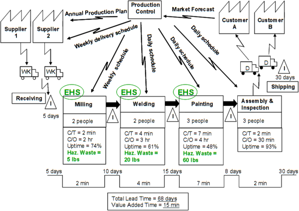 Analysis of this value stream diagram can highlight unnecessary space, excessive distance traveled, processing inefficiencies, and so on. Value stream mapping is associated with so-called “lean enterprise” initiatives. At Toyota, where the technique originated, it is known as “material and information mapping” (Rother 2009). Various value stream mapping tools are available (Hines and Rich 1997).