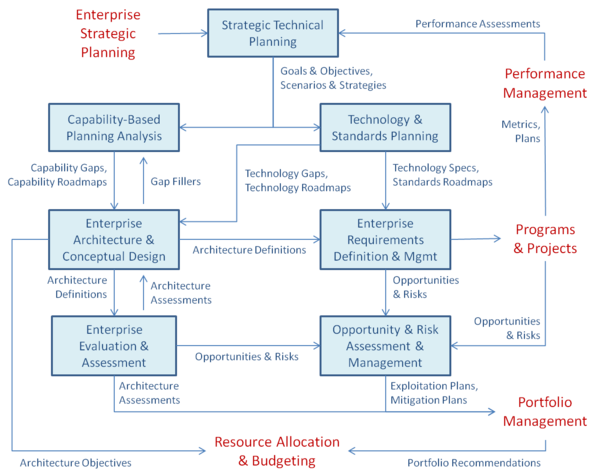 Government agencies have been increasingly turning to SE to solve some of their agency-level (i.e., enterprise) problems. This has sometimes led to the use of an architecture-based investment process, especially for information technology procurements. This approach imposes a requirement for linking business strategies to the development of EAs. The Federal Enterprise Architecture Framework (FEAF) (CIO Council 1999) and the DoD Architecture Framework (DoDAF) (DoD 2010) were developed to support such an architecture-based investment process. There have been several other architecture frameworks also developed for this purpose (ISO 2000; ISO/IEC 1998; NATO 2004; TOGAF 2009; MOD 2010; TRAK 2010).