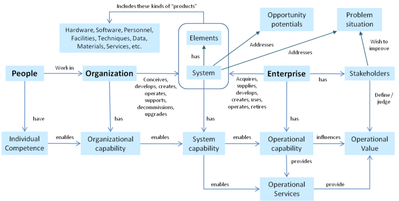 In some domains there may be competency roadmaps dealing with the organizational capabilities, with perhaps the desired competency levels of individuals mapped out in terms of the jobs or roles used in the enterprise or perhaps in terms of the knowledge and skills required for certain activities. (For more information on systems engineering competency, see the Enabling Individuals article.)
