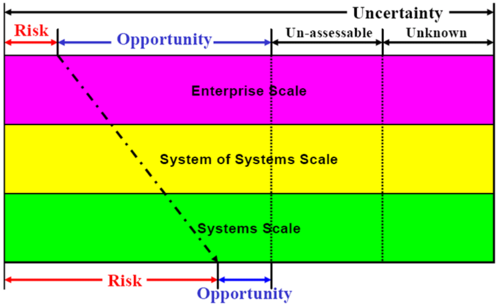 White claims that “in systems engineering at an enterprise scale the focus should be on opportunity, and that enterprise risk should be viewed more as something that threatens the pursuit of enterprise opportunities” (White 2006). The figure below (Rebovich and White 2011, chapter 5) shows the relative importance of opportunity and risk at the different scales of an individual system, a system of systems (SoS), and an enterprise. The implication is that, at the enterprise level, there should be more focus on opportunity management than on risk management.