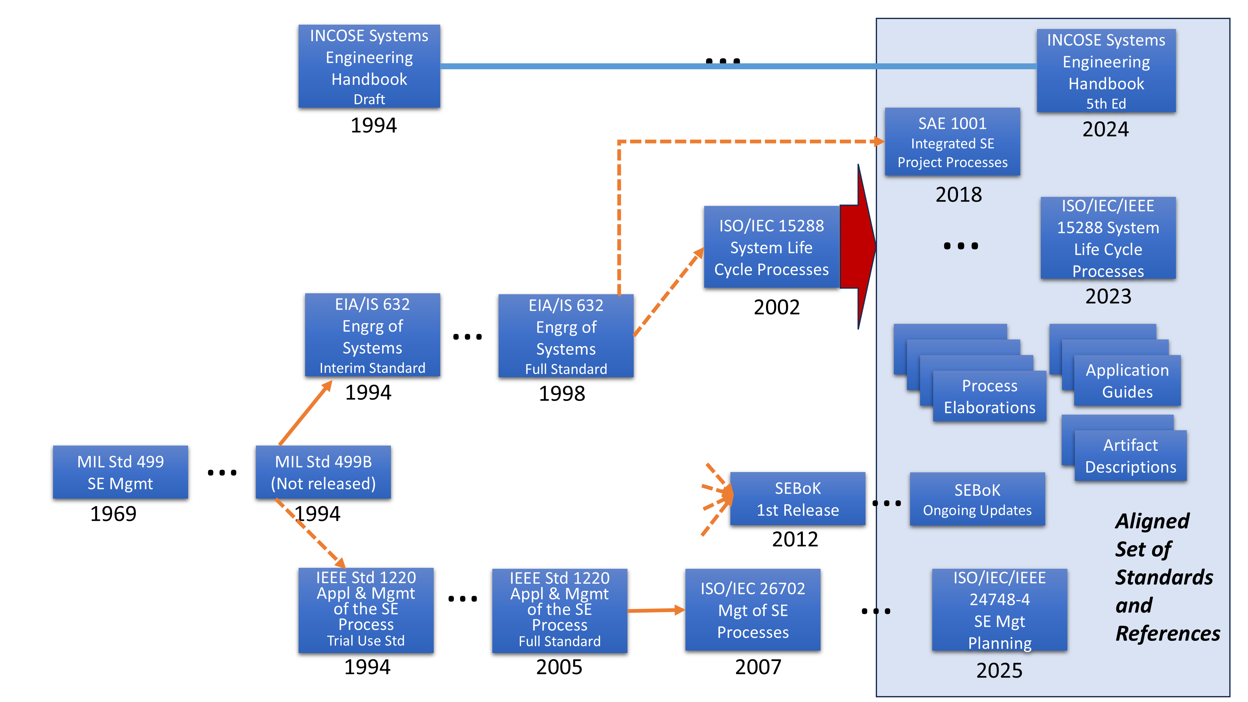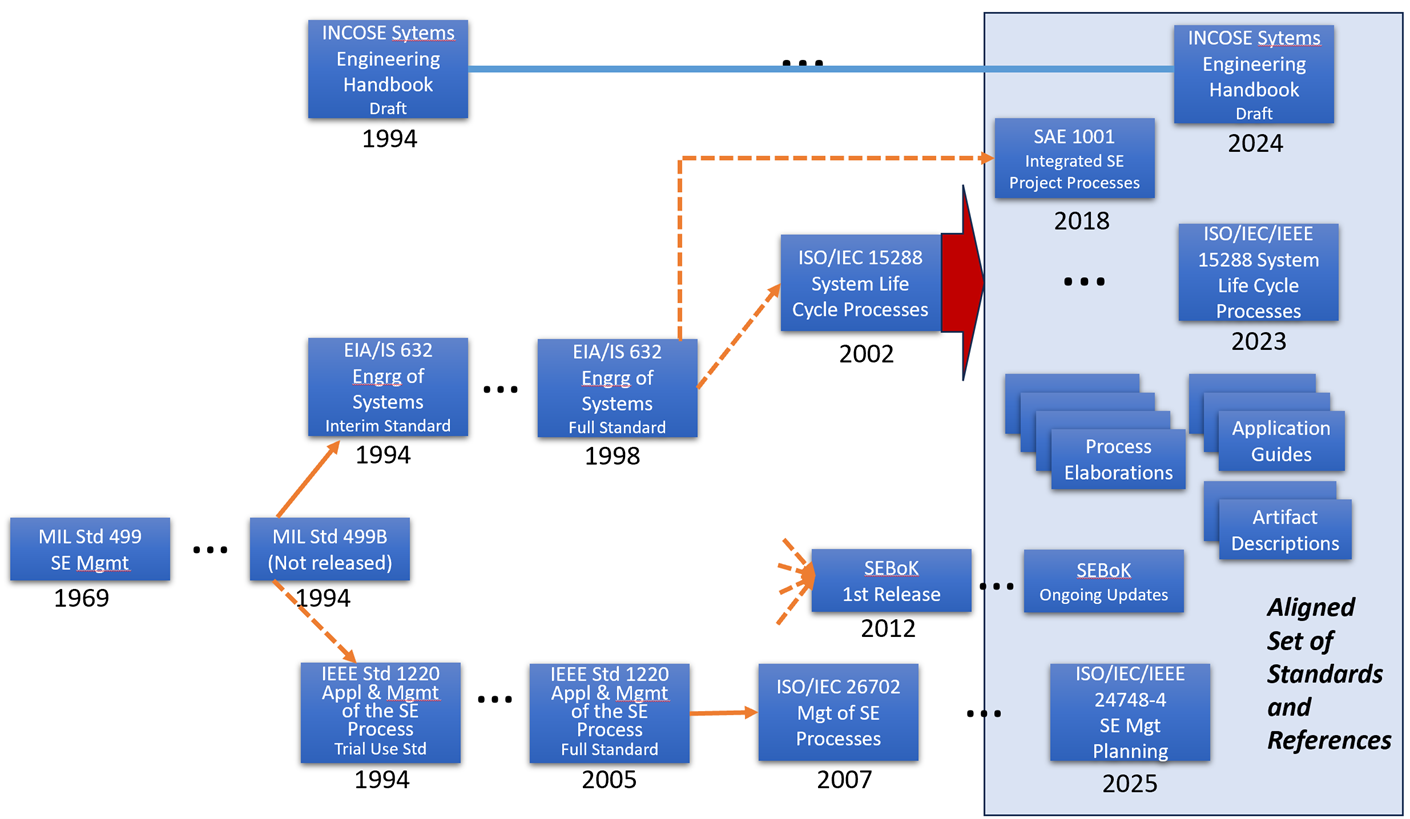 Evolution of Key SE Standards and References Source: Garry Roedler (adapted from Roedler 2023) Reprinted with permission of Garry Roedler. All other rights are reserved by the copyright owner.
