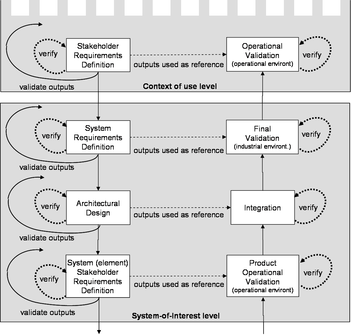Figure. Verification and Validation Actions in Upper Levels of System Decomposition. SEBoK Original.