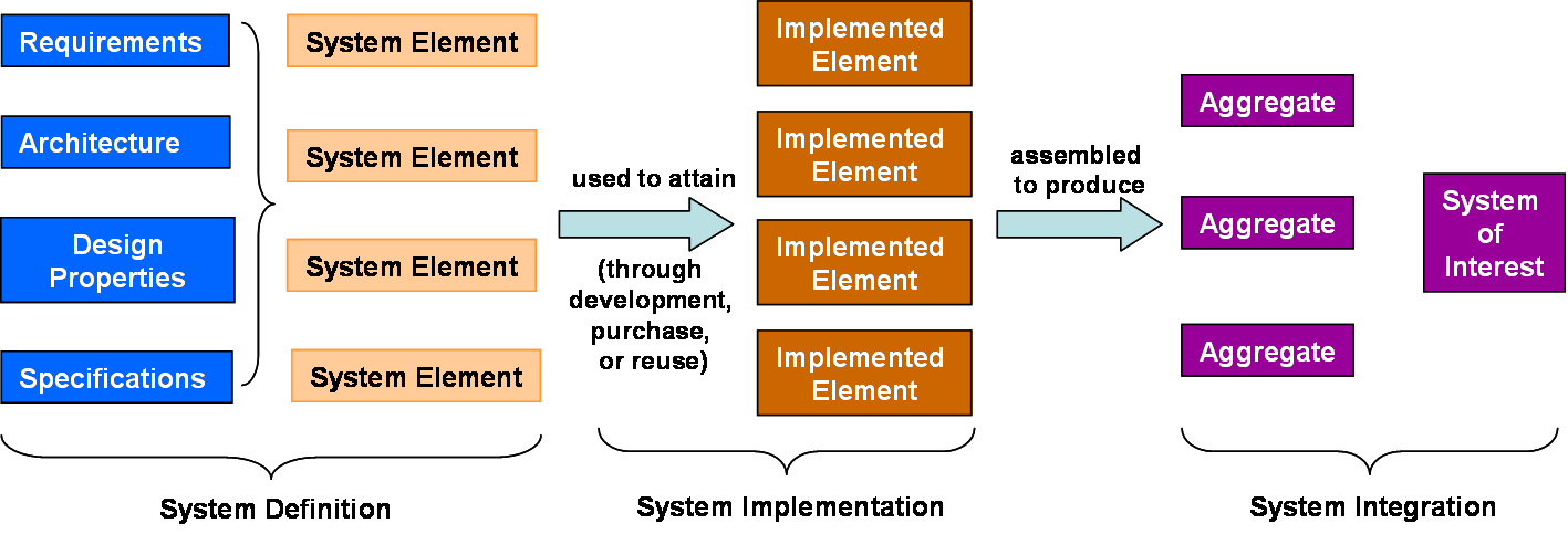 Figure. Simplification of How the Outputs of System Definition Relate to System Implementation, which Produces the System Elements Required to Produce Systems and Subsystems. SEBoK Original.
