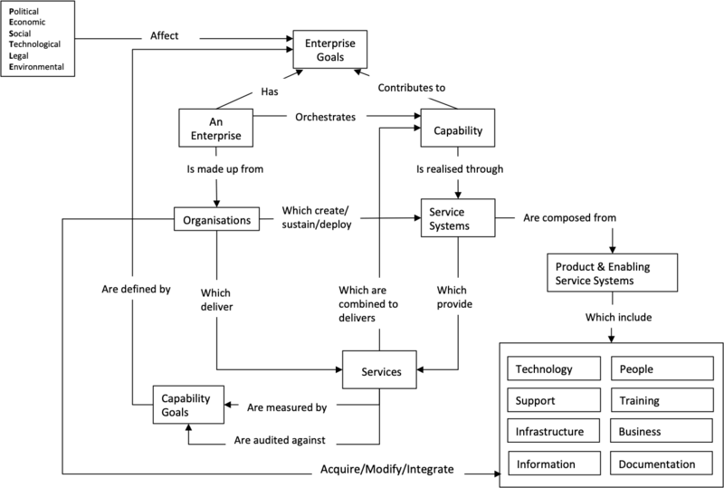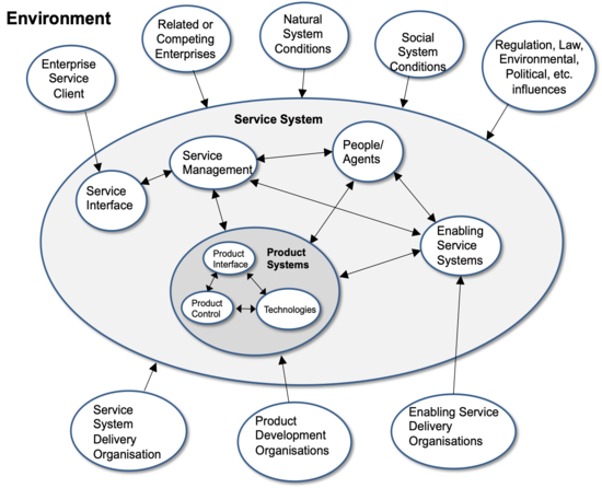 In the above figure the capability needed to enable an enterprise to achieve its goals is delivered by the synchronized use of services. Those services are provided by a service system ,which is created, sustained and deployed by one or more organizations. A service system is composed of people, technology, information, and access to related services and other necessary resources. Some of these resources are provided by enabling services and the technological elements may be developed and supplied as product systems. An enterprise system describes a collection of related capabilities and associated services which together enable the achievement of the overall purpose of an enterprise as a government, business or societal entity. Measurement and review of enterprise goals may define needs for change which require an organization to acquire or modify, and integrate the elements needed to evolve its service systems. The general terminology above is described briefly in the associated glossary definitions and expanded in related articles in Part 4: Applications of Systems Engineering.