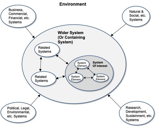 The International Council on Systems Engineering Handbook (INCOSE 2015) generalizes this idea, defining system as “an interacting combination of elements to accomplish a defined objective. These include hardware, software, firmware, people, information, techniques, facilities, services, and other support elements." While these definitions cover the socio-technical systems created by SE, it is also necessary to consider the natural or social problem situations in which these systems sit, the social systems which developed, sustained and used them, and the commercial or public enterprises in which these all sit as systems (Martin 2004).