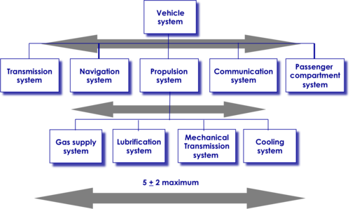 A complex system composed of thousands of physical and/or intangible parts may be structured in several layers of systems and system elements. The number of elements in a level of the structure of one system is limited to only a few, in order to facilitate managing the system definition; a common guideline is five plus or minus two elements (see illustration in Figure 1).