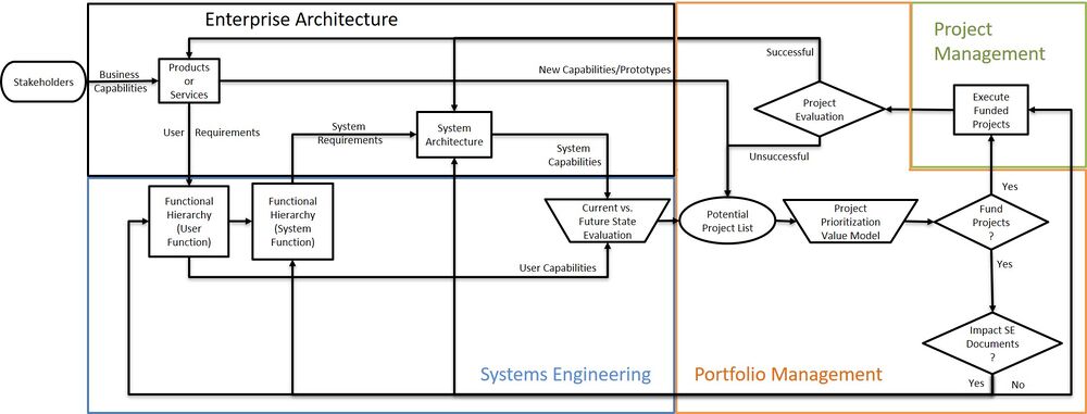 It is often difficult for systems engineers to understand the relationships between systems engineering, portfolio management, and project management because of their overlapping processes and the use of similar tools. Figure 1 shows the role of project management, systems engineering, and portfolio management for developing and improving an enterprise architecture to provide products or services to many stakeholders. Project and program managers and systems engineers all interact with stakeholders and the enterprise architecture, which consists of products or services and the systems that make them. Systems engineers use the enterprise architecture to develop user and system functional hierarchies, which enable capability development. These capabilities help systems engineers evaluate the enterprise’s current and future states. From this evaluation, the Project Management Office (portfolio managers) can develop a potential list of projects or programs to fund. Portfolio managers use best practices in decision analysis (Parnell et al. 2013) to develop a project prioritization value model (e.g. single or multiple objective decision analysis model). Portfolio managers then use optimization techniques to determine which projects or programs to fund based upon the prioritization value model. Project managers then execute the funded projects to ensure that the projects stay on schedule and within budget constraints while meeting desired performance metrics. Information impacting systems engineering documentation discovered from the funded projects updates the functional hierarchies and system architecture. Throughout the project, portfolio managers receive updates from project managers on project progress. Portfolio managers use progress information to evaluate the project for continuation or termination. If the project is terminated upon successful completion of the project, the project’s outcomes update the enterprises’ architecture. Otherwise (i.e. terminated early or upon an unsuccessful completion), portfolio managers update their list of potential projects and/or programs for reprioritization. This cycle continues and evolves with time based upon the enterprise’s strategy.