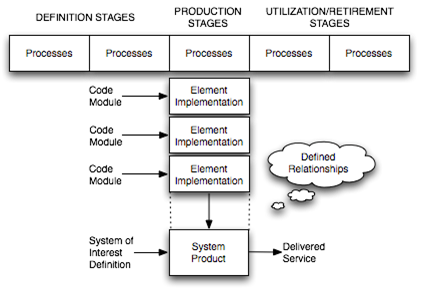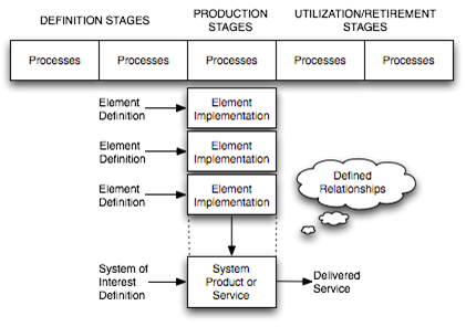 The (T) model indicates that a definition stage precedes a production stage where the implementation (acquisition, provisioning, or development) of two or more system elements has been accomplished. The system elements are integrated according to defined relationships into the SoI. Thus, both the process and product aspects are portrayed. The implementation and integration processes are followed in providing the primary stage results—namely, in assembled system product or service instances. However, as noted in life cycle models, the definition of the SoI when provided in a development stage can also be the result of first versions of the system. For example, a prototype, which may be viewed as a form of production or pre-production stage. Following the production stage is a utilization stage. Further relevant stages can include support and retirement. Note that this model also displays the important distinction between definition versus implementation and integration.