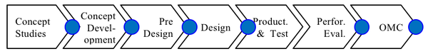 The project life cycle for the SKLTS is summarized in Figure 2. It consisted of 7 phases: concept studies, concept development, preliminary design, design, system production and testing, performance evaluation, and operation/maintenance/close-out (OMC) - please see (Choi 2007) and (Chung et al. 2010) for further details. These phases, with the exception of the production and test phases, are completed through an evaluation and decision point (EDP) (milestonemilestone), depicted as a colored circle in Figure 2. These EDPs correspond to common life cycle artifacts such as requests for proposal (RFPs), proposals, preliminary design reviews (PDRs), and critical design reviews (CDRs).