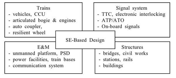 The elements of the SKLTS were classified into four groups (as shown in Figure 1): trains, signal systems, electric and machinery (E&M) systems, and structures. Trains and vehicles were to be automatically operated, without need for human operators. Operation systems and their interfaces were based on digital signals and communications. For SKLTS, SE-based design activities focused on reliability, availability, maintainability, and safety (RAMS), and were integrated into project management (PM) activities during all phases.