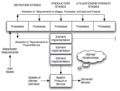 Lawson (Lawson 2010) elaborates on the activities in each life cycle stage and notes that it is useful to consider the structure of a generic life cycle stage model for any type of system-of-interest (SoI) as portrayed in Figure 4. This (T) model indicates that one or more definition stages precede a production stage(s) where the implementation (acquisition, provisioning, or development) of two or more system elements has been accomplished.